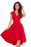 300-2 PATRICIA - sukienka z dłuższym tyłem i koronkowym dekoltem - CZERWONA