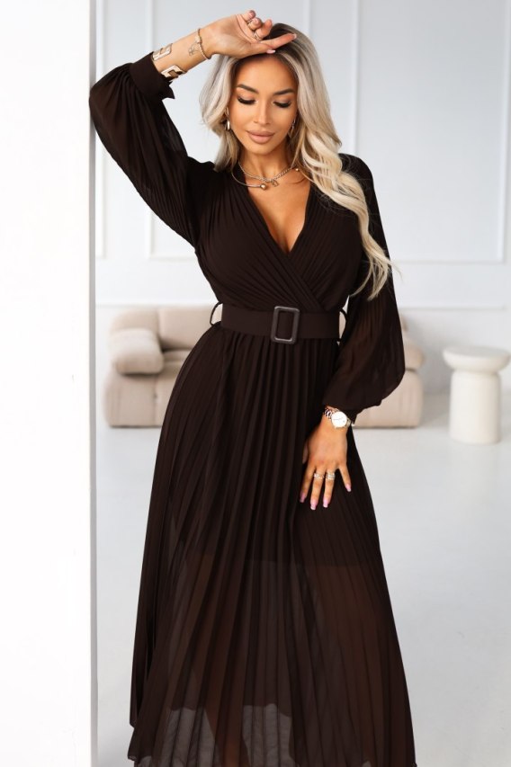414-11 KLARA plisowana elegancka sukienka midi z paskiem i dekoltem - czekoladowa