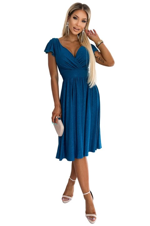 425-5 MATILDE Sukienka z dekoltem i krótkim rękawkiem - MORSKA z brokatem
