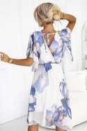 602-1 Romantyczna sukienka z kopertowym dekoltem i zwiewnymi rękawkami - błękitne kwiaty na białym tle