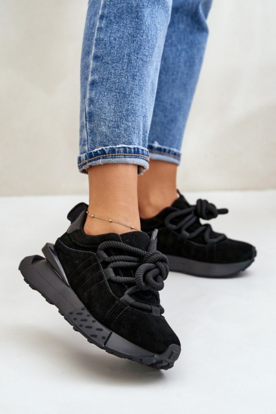 Sneakersy damskie wykonane z naturalnego zamszu. Osadzone na platformie. Model ten wyróżnia się grubym sznurowaniem. Platforma zapewnia dodatkowy komfort i lekkość podczas chodzenia, jednocześnie dodając kilku centymetrów wzrostu. Idealne do codziennych outfitów, jak i bardziej casualowych zestawów. Wybierz je, aby podkreślić swój wyjątkowy styl i cieszyć się wygodą przez cały dzień.