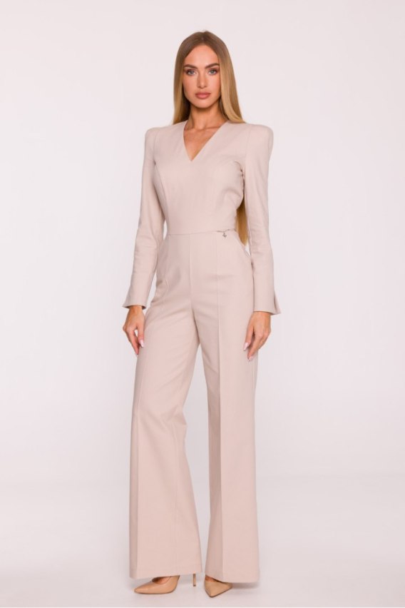 Elegancki kombinezon uszyty z tkaniny imitującej denim to wyjątkowa propozycja łącząca nowoczesny styl z klasyczną formą. Lekko sztywna, matowa i delikatnie elastyczna tkanina pięknie trzyma fason, a podszewka ( 95% poliester, 5% elastan) zapewnia komfort i nienaganne układanie się całości. Model wyróżnia się dekoltem w kształcie litery V, który subtelnie wysmukla szyję i dodaje sylwetce lekkości. Długie rękawy zakończone delikatnym rozkloszowaniem przy mankiecie wprowadzają elegancki, wyrafinowany akcent. Zapięcie na kryty zamek z tyłu sprawia, że całość prezentuje się spójnie i schludnie. Góra kombinezonu ma wyraźnie zarysowaną, strukturalną linię ramion i dopasowaną talię, którą dodatkowo podkreśla metalowy łańcuszek z logo. Szerokie nogawki typu palazzo, sięgające do ziemi, optycznie wydłużają sylwetkę i nadają jej wyważone, wysmuklone proporcje. Zaprojektowany i uszyty w Polsce, stworzony z myślą o kobietach, które cenią nowoczesną elegancję, komfort oraz perfekcyjne wykończenie w każdym detalu.