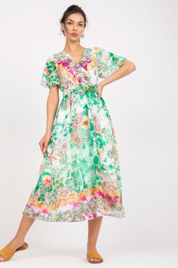 Ta sukienka to kwintesencja codziennej elegancji, łącząca w sobie wygodę i styl. Wyposażona w kolorowy nadruk, dodaje jej radości i energii, idealnie pasując do każdej okazji. Jej rozkloszowany fason sprawia, że jest niezwykle kobieca i nadaje się zarówno na spotkania towarzyskie, jak i do pracy. Wykonana z poliestru, sukienka jest łatwa w pielęgnacji i utrzymaniu, jednocześnie zachowując doskonały wygląd przez długi czas. Jej długość midi nadaje jej uniwersalny charakter, który można łatwo dopasować do różnych okoliczności. Krótki rękaw oraz dekolt w serek, o kopertowym kroju, dodają sukience subtelności i kobiecej elegancji, podkreślając delikatność sylwetki. Dodatkowo, sukienka posiada podszewkę, co zapewnia dodatkowy komfort noszenia oraz lepsze dopasowanie do ciała. Aby podkreślić talię i dodać sukience dodatkowego uroku, dołączony jest pasek w tym samym kolorze co nadruk. Dzięki połączeniu stylu, wygody i funkcjonalności, ta sukienka staje się niezastąpionym elementem garderoby, który sprawi, że każdy dzień będzie pełen pewności siebie i elegancji.