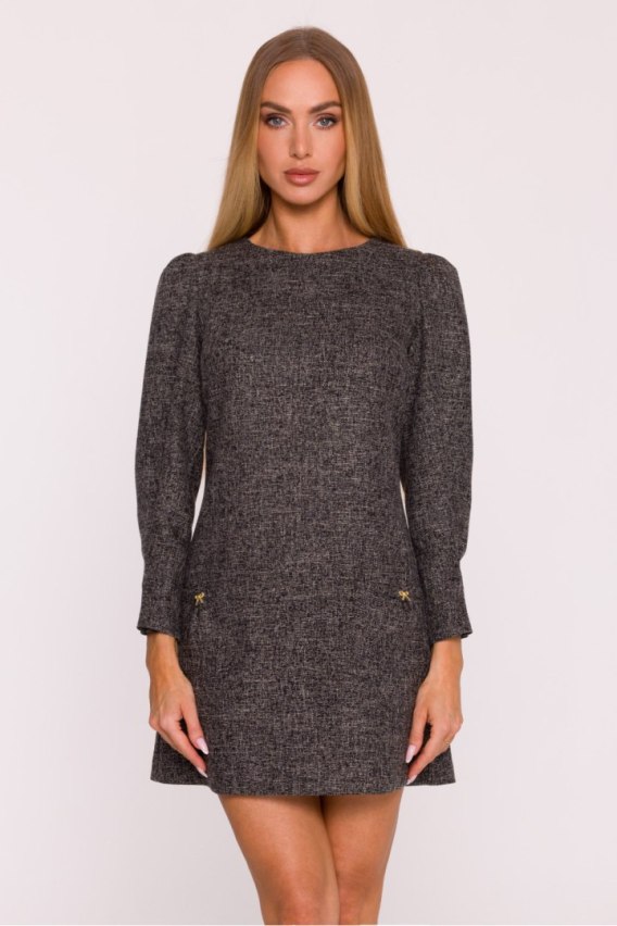 Elegancka sukienka z tkaniny tweedowej w melanżowym wzorze to propozycja łącząca klasyczny szyk z dziewczęcym wdziękiem. Strukturalny materiał pięknie układa się na sylwetce, a jego charakterystyczna faktura nadaje całości wyrazistego stylu. Model z dekoltem w kształcie łódki i długimi rękawami marszczonymi na ramionach prezentuje się subtelnie i kobieco. Zaszewki u dołu rękawów dodają im eleganckiej formy, a kryty zamek z tyłu zapewnia wygodę i estetyczne wykończenie. Na przodzie umieszczono naszywane kieszenie ozdobione biżuteryjnymi kokardkami, które przełamują klasyczną linię fasonu i wprowadzają efektowny, dekoracyjny akcent. Trapezowy krój, delikatnie dopasowany w ramionach i swobodny w biodrach, gwarantuje komfort noszenia i piękną, harmonijną sylwetkę. Mini długość nadaje sukience lekkości i nowoczesnego charakteru. Zaprojektowana i uszyta w Polsce idealna dla kobiet, które cenią elegancję z nutą oryginalnych detali.