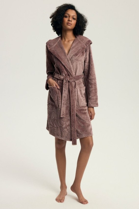 Miękki i przytulny szlafrok damski o luźnym, komfortowym kroju, idealny do codziennego użytku i jako homewear. Wykonany z tkaniny o tłoczonym wzorze, która nadaje całości eleganckiego i kobiecego wyglądu. Model posiada kaptur, praktyczne kieszenie oraz wiązanie w pasie, pozwalające dopasować szlafrok do sylwetki. Długość przed kolano zapewnia wygodę i swobodę ruchów. Szlafrok pakowany w woreczek foliowy, doskonały również jako prezent.