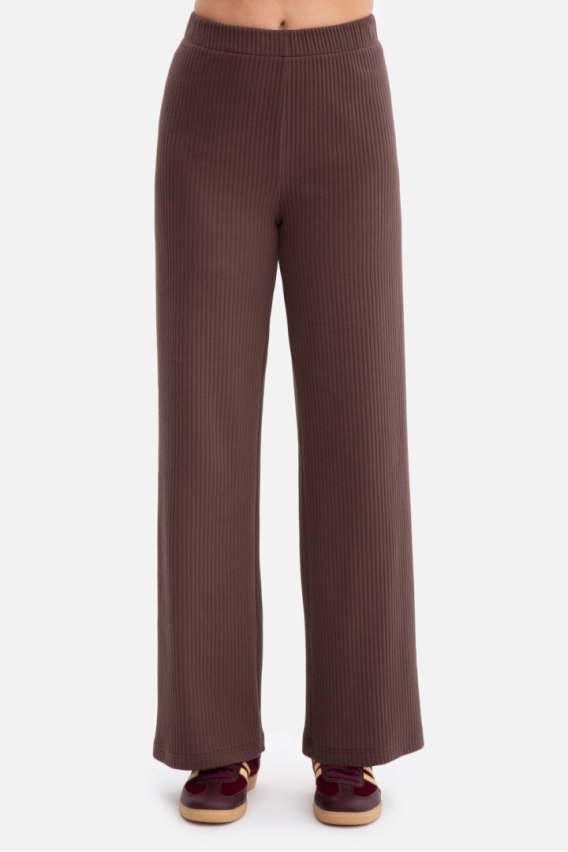 Spodnie damskie uszyte z prążkowanej dzianiny o gramaturze 250 g, która jest miękka, elastyczna i przyjemna w noszeniu. Model bez kieszeni i podszewki, z praktyczną gumką w pasie, zapewniającą komfort i dopasowanie do sylwetki. Fason swobodny, dzianinowy spodnie są dopasowane w talii i biodrach, a dalej układają się luźno, gwarantując wygodę i lekkość. Długie, proste nogawki lekko rozszerzane ku dołowi wysmuklają sylwetkę i dodają całości elegancji. Średni stan sprawia, że spodnie dobrze leżą i podkreślają talię, a pełna długość do ziemi nadaje im nowoczesny, wydłużający nogi efekt. Zaprojektowane i uszyte w Polsce z dzianiny wyprodukowanej w Łodzi, to połączenie wygody, jakości i ponadczasowego stylu.