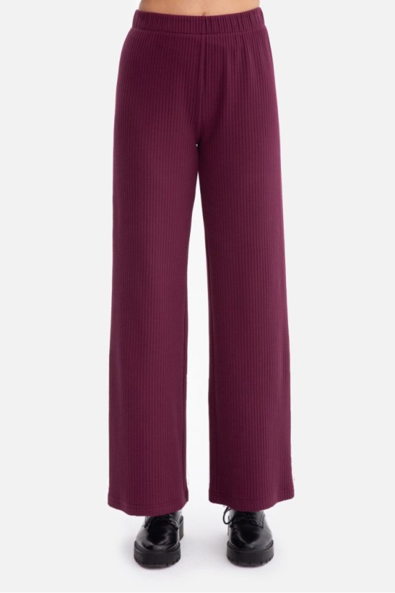 Spodnie damskie uszyte z prążkowanej dzianiny o gramaturze 250 g, która jest miękka, elastyczna i przyjemna w noszeniu. Model bez kieszeni i podszewki, z praktyczną gumką w pasie, zapewniającą komfort i dopasowanie do sylwetki. Fason swobodny, dzianinowy spodnie są dopasowane w talii i biodrach, a dalej układają się luźno, gwarantując wygodę i lekkość. Długie, proste nogawki lekko rozszerzane ku dołowi wysmuklają sylwetkę i dodają całości elegancji. Średni stan sprawia, że spodnie dobrze leżą i podkreślają talię, a pełna długość do ziemi nadaje im nowoczesny, wydłużający nogi efekt. Zaprojektowane i uszyte w Polsce z dzianiny wyprodukowanej w Łodzi, to połączenie wygody, jakości i ponadczasowego stylu.