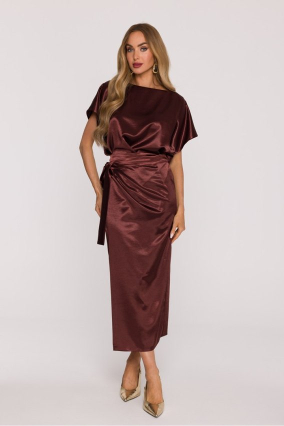 Subtelna i elegancka sukienka midi z satyny, która zachwyca prostotą formy i szlachetnym połyskiem tkaniny. Uszyta z gładkiej, mięsistej satyny, miękko otula sylwetkę i pięknie odbija światło, tworząc efekt luksusowej lekkości. Model posiada dekolt typu łódka, który delikatnie eksponuje linię ramion i szyi, a krótkie, luźne rękawy dodają zwiewności i komfortu. Góra sukienki ma luźniejszy fason, dzięki czemu można ją subtelnie wypuścić ze spódnicy, tworząc swobodną, naturalną linię. Dół wiązany jak pareo wokół talii pozwala na dopasowanie fasonu do sylwetki i podkreślenie talii w stylowy, kobiecy sposób. Sukienka nie posiada podszewki, co sprawia, że pozostaje lekka, przyjemna w dotyku i idealna na cieplejsze dni. Model zaprojektowano i uszyto w Polsce z najwyższą starannością o detal. To elegancka satynowa sukienka midi, która łączy komfort, minimalizm i kobiecy urok idealna na przyjęcia, spotkania i letnie okazje, gdy chcesz wyglądać szykownie, ale z naturalną lekkością.